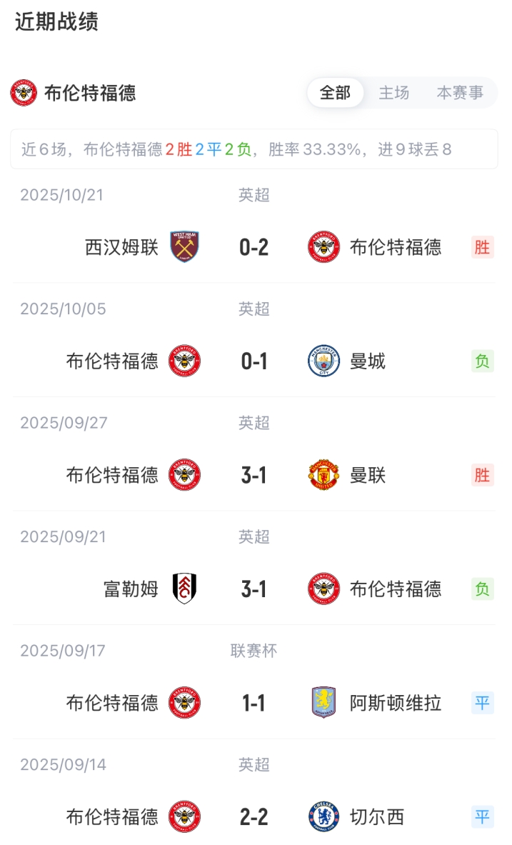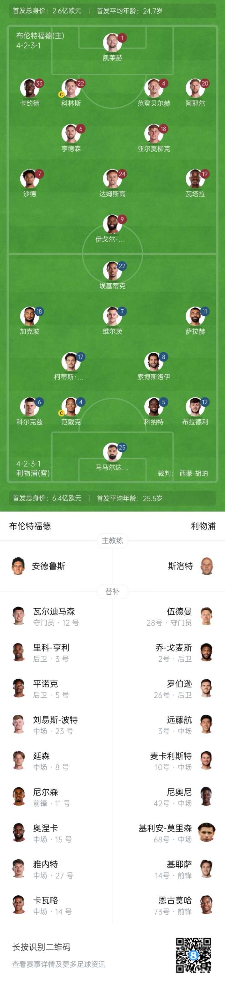 布伦特福德首发:1-凯莱赫、20-阿耶尔、4-范登贝尔赫、22-科林斯、33-卡约德、6-亨德森、18-亚尔莫柳克、24-达姆斯高、7-沙德、19-瓦塔拉、9-伊戈尔·蒂亚戈